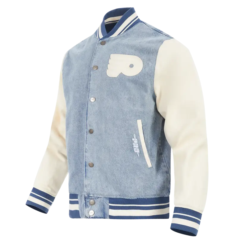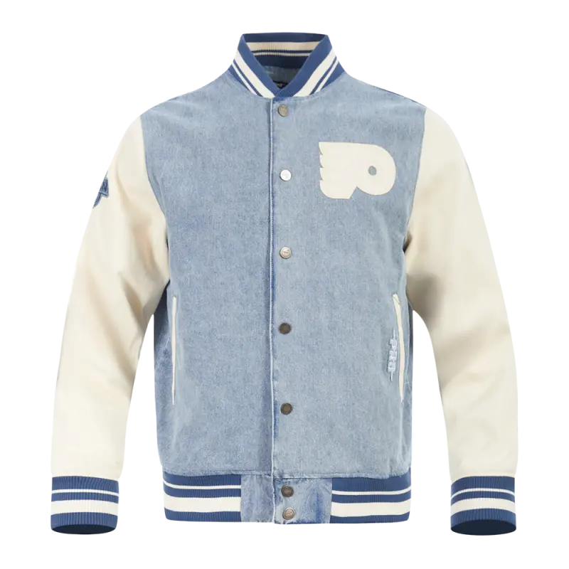 NHL PHILADELPHIA FLYERS VARSITY BLUES MEN’S DENIM VARSITY JACKET (DENIM\/LINEN)