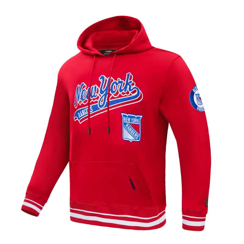 NHL NEW YORK RANGERS SCRIPT TAIL MEN’S RIB FLEECE PULLOVER HOODIE (RED)