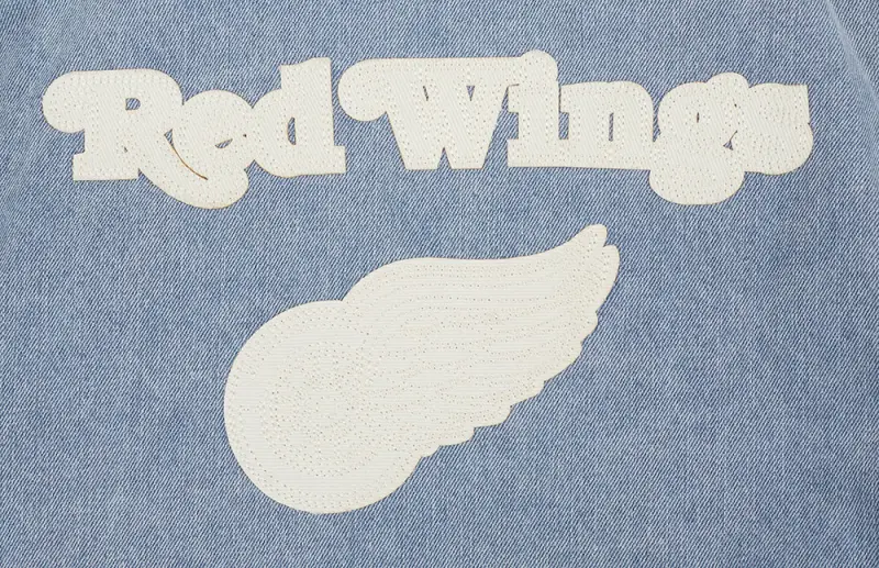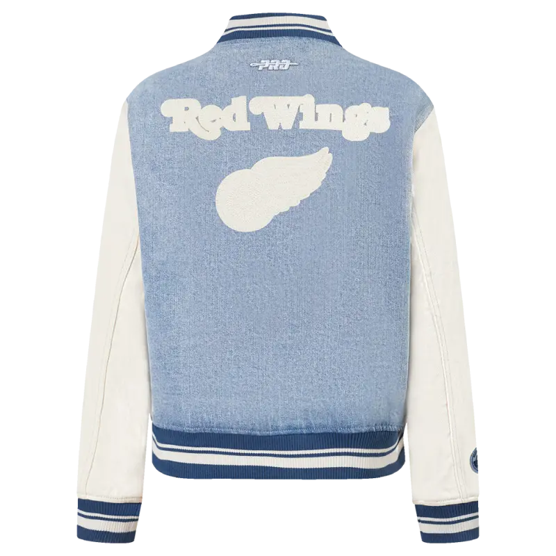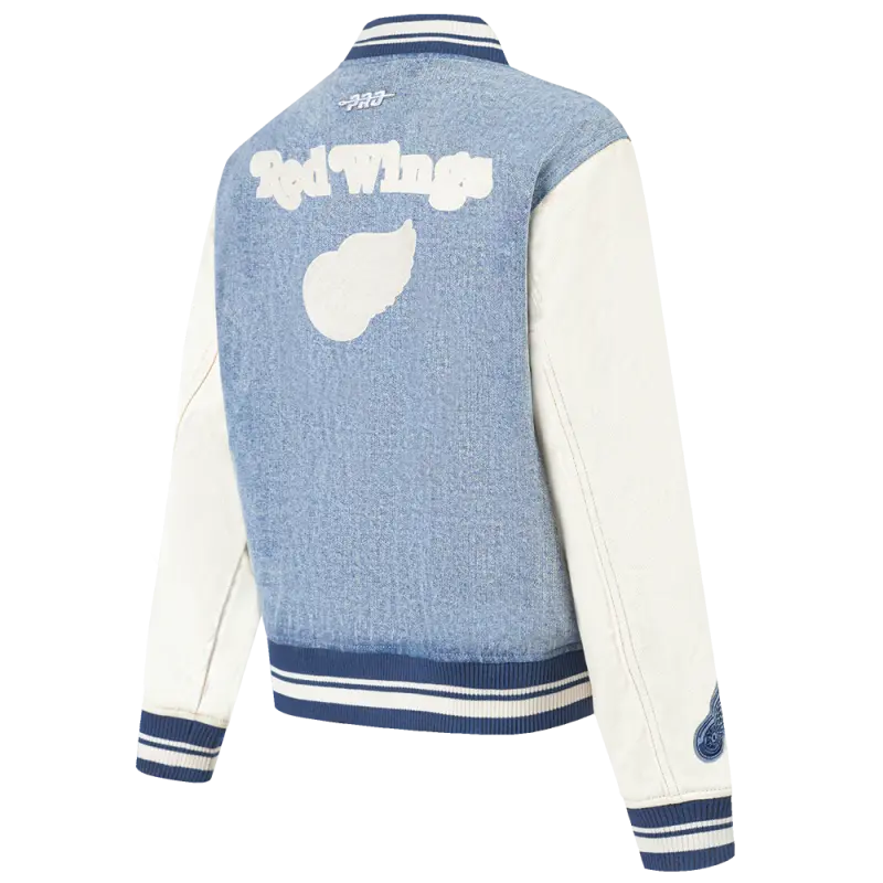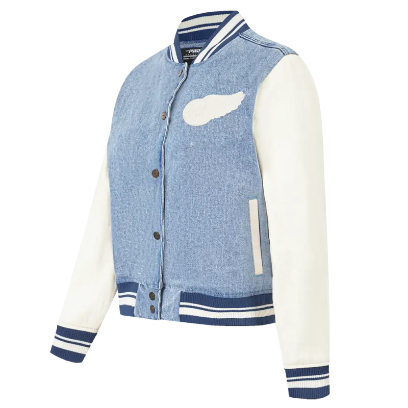 NHL DETROIT RED WINGS VARSITY BLUES WOMEN’S DENIM VARSITY JACKET (DENIM\/LINEN)